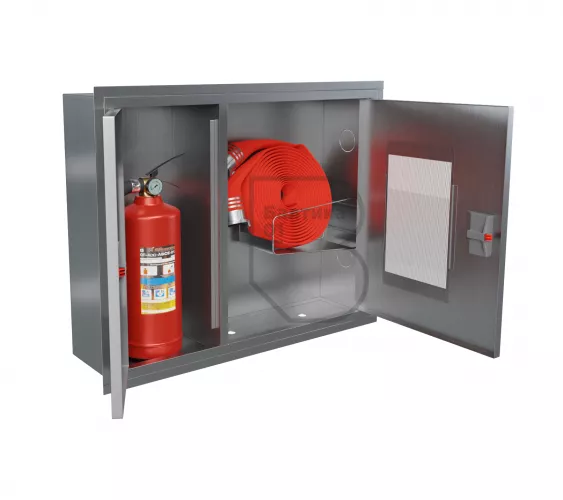 Шкаф пожарный ШПК-315 ВО из нержавеющей стали – предназначен для размещения и хранения рукава пожарного в сборе, пожарного вентиля (клапана) и одного огнетушителя до 5 литров. Шкаф оборудован кассетой (турелью) для пожарного рукава.