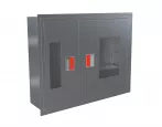 Дверцы пожарного шкафа открываются на 160 градусов. Имеют запорное устройство в виде пластиковой защелки.