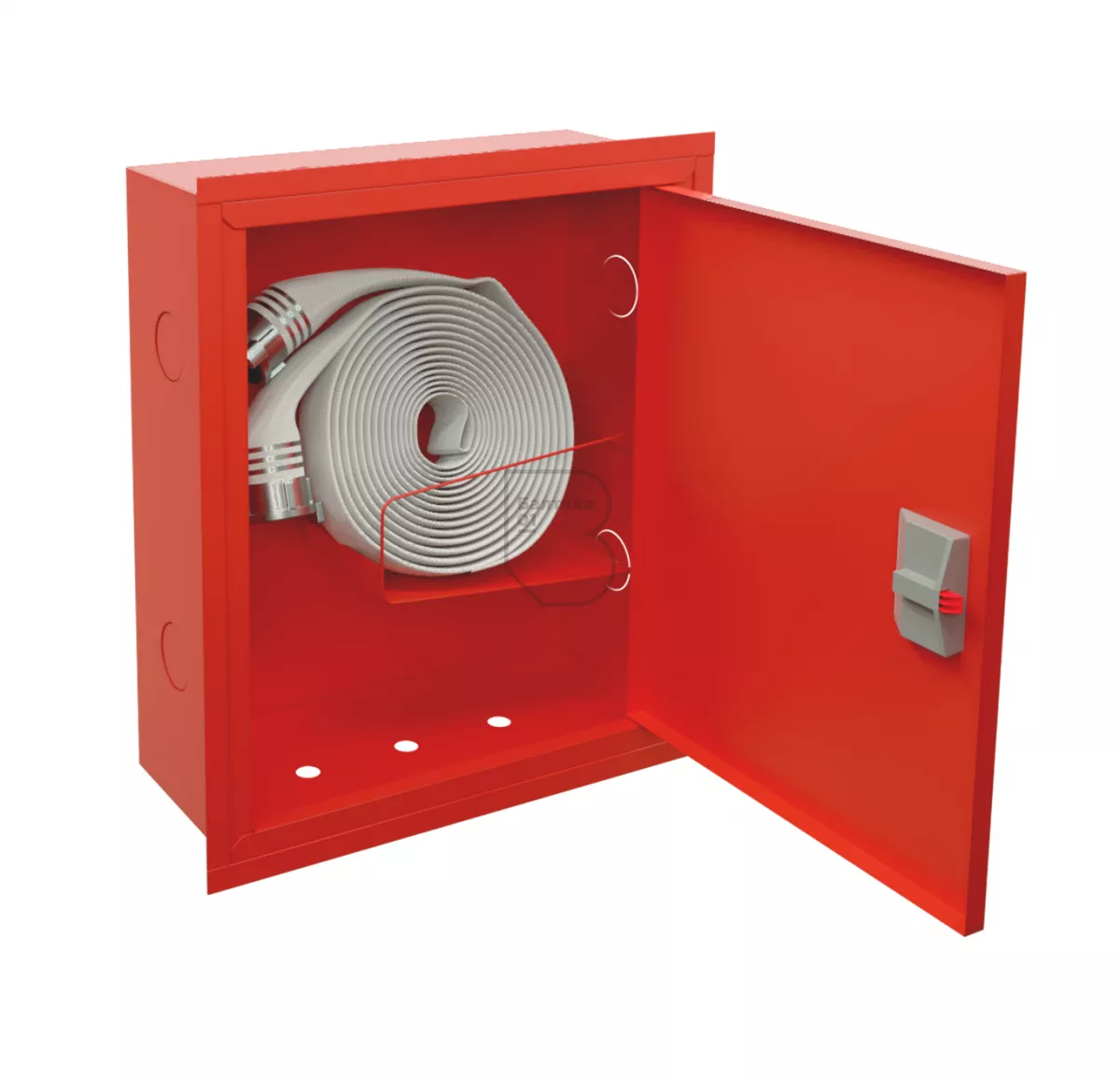 Дверца пожарного шкафа открывается на 160 градусов. Имеет запорное устройство в виде пластиковой защелки.