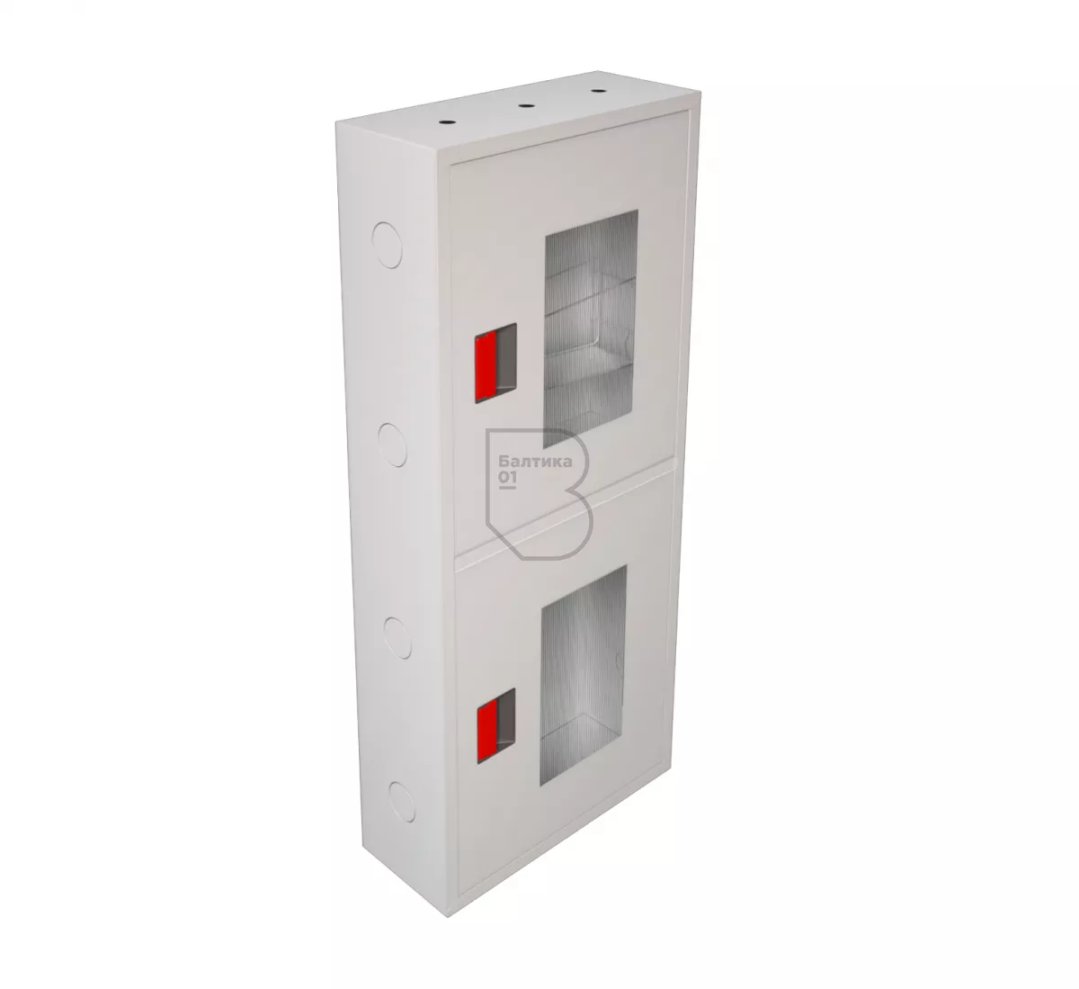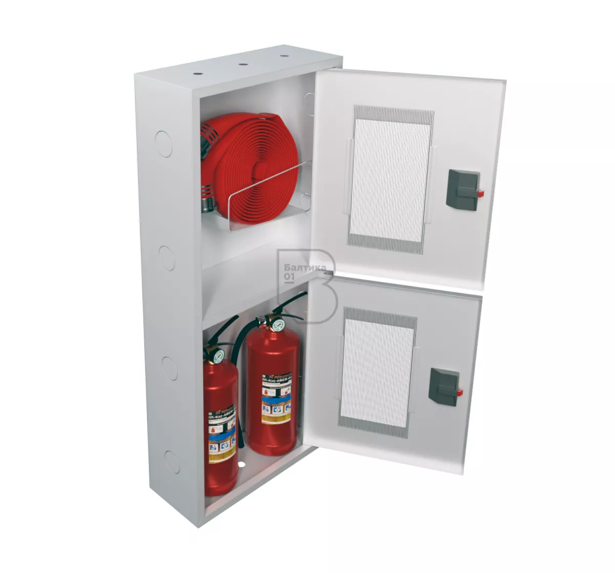Дверцы пожарного шкафа открываются на 160 градусов. Имеют запорное устройство в виде пластиковой защелки. На каждой дверце имеется смотровое окно со вставкой из поликарбоната.