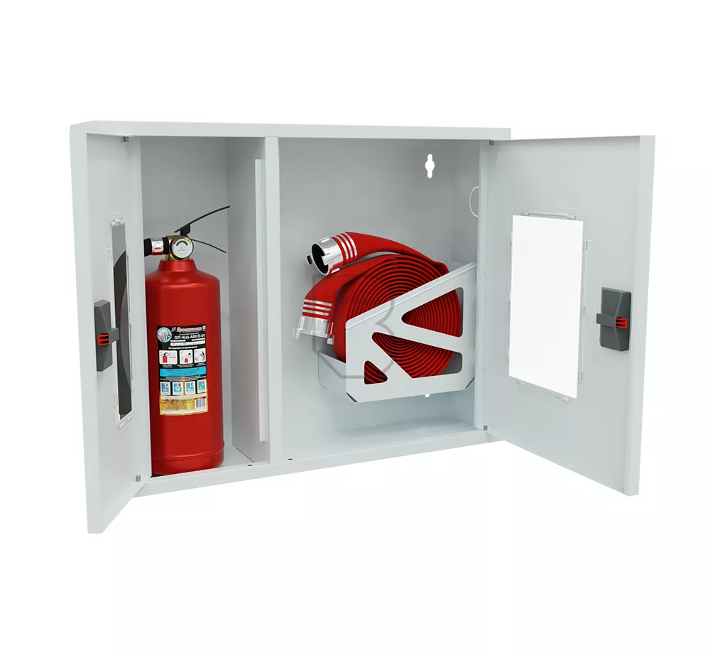 Дверца пожарного шкафа открывается на 160 градусов, открывание двери универсальное (правое и левое). Дверца имеет дополнительные загибы для усиления жесткости конструкции. На двери и корпусе шкафа предусмотрены отверстия для опломбирования шкафа. Дверь пожарного шкафа имеет запорное устройство в виде пластиковой защелки. Дверь закреплена с помощью монтажного штифта, при необходимости она может быть снята в результате простого нажатия на кнопку штифта. На каждой дверце имеется смотровое окно со вставкой из стекла.