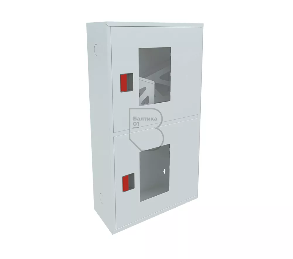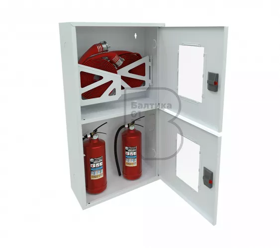 Дверца пожарного шкафа открывается на 160 градусов, открывание двери универсальное (правое и левое). Дверца имеет дополнительные загибы для усиления жесткости конструкции. На двери и корпусе шкафа предусмотрены отверстия для опломбирования шкафа. Дверь пожарного шкафа имеет запорное устройство в виде пластиковой защелки. Дверь закреплена с помощью монтажного штифта, при необходимости она может быть снята в результате простого нажатия на кнопку штифта. На каждой дверце имеется смотровое окно со вставкой из стекла.