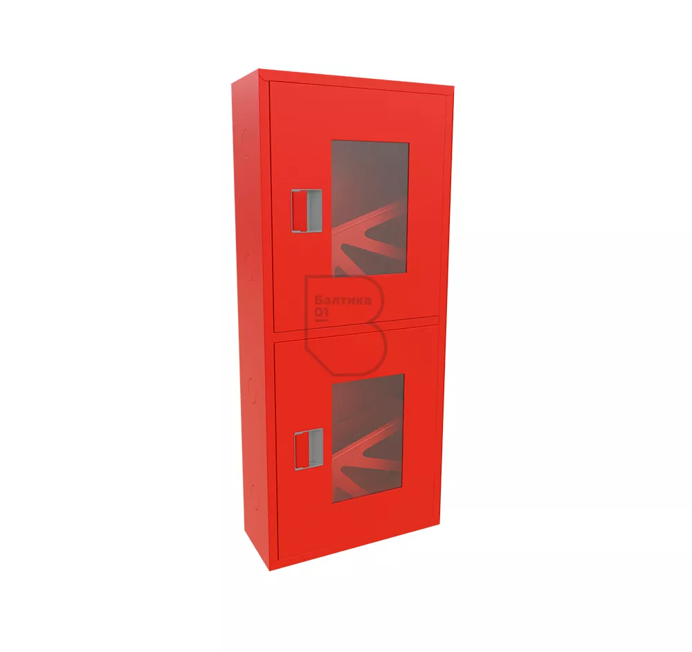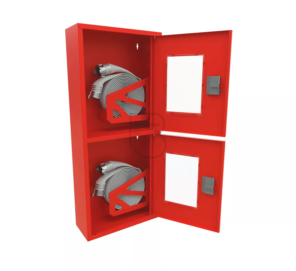 Дверца пожарного шкафа открывается на 160 градусов, открывание двери универсальное (правое и левое). Дверца имеет дополнительные загибы для усиления жесткости конструкции. На двери и корпусе шкафа предусмотрены отверстия для опломбирования шкафа. Дверь пожарного шкафа имеет запорное устройство в виде пластиковой защелки. Дверь закреплена с помощью монтажного штифта, при необходимости она может быть снята в результате простого нажатия на кнопку штифта. На каждой дверце имеется смотровое окно со вставкой из стекла.