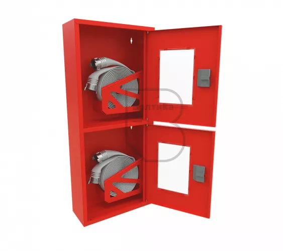 Дверца пожарного шкафа открывается на 160 градусов, открывание двери универсальное (правое и левое). Дверца имеет дополнительные загибы для усиления жесткости конструкции. На двери и корпусе шкафа предусмотрены отверстия для опломбирования шкафа. Дверь пожарного шкафа имеет запорное устройство в виде пластиковой защелки. Дверь закреплена с помощью монтажного штифта, при необходимости она может быть снята в результате простого нажатия на кнопку штифта. На каждой дверце имеется смотровое окно со вставкой из стекла.