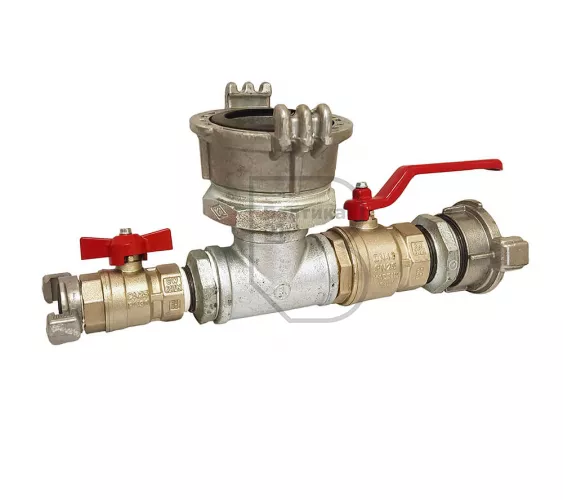 Поток жидкости со входа 80 мм разделяется на два выхода, 50 и 25 мм, каждый из которых оснащается перекрывным краном.